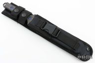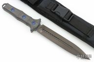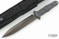 This Nephilim by Heretic Knives features a double-edged and DLC Black blade, .208" blade stock and 1.183" blade depth, full tang construction. The handle has carbon fiber scales with blue hardware, lanyard hole at the butt. Comes with a nylon sheath. Excellent condition. S/N 01117