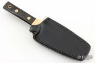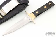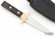 This Fang boot dagger by Al Mar Knives features a double-edged mirror finished blade, .121" blade stock and .727" blade depth, full tang construction. The handle has brass bolsters, pins and lanyard tube, and black/brown paper micarta scales. Includes a black leather sheath.  Excellent Condition.