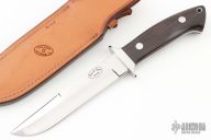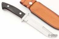 This Chute by Bruce Bump features a mirror finished blade with sharpened top edge, .190" blade stock and .999" blade depth, full tapered tang construction. The handle has stainless steel guard, African blackwood scales with stainless steel pins. Comes with a brown leather sheath. Has a few light scratches, otherwise excellent condition.