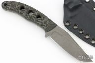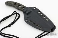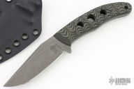 This Nomad by Tom Krein features an acid washed blade with .131" blade stock and 1.035" blade depth. The handle is comprised of black/green G-10 scales with black liners and pins and a lanyard tube over full tang construction. Includes Kydex sheath. Excellent condition.