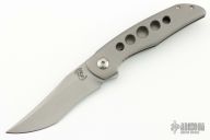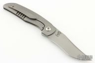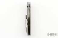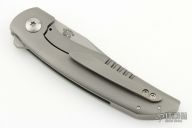 This Intrinsic by John Barker features a bead blast finished recurve tanto blade with a notched thumbrest and flipper. The handle has a bead blasted titanium frame with matching backspacer and tip up clip. Nice detent, lockup and blade seating. Comes with maker's pouch. Excellent condition.