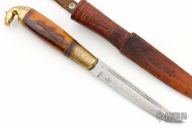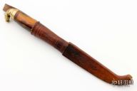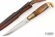 This Pukko features a satin finished blade with fullers and a hidden tang construction.  .137" Blade Stock.  .583" Blade Depth.  The handle has brass bolsters and pommel with a synthetic grip.  Includes a brown leather sheath.  Scuffs, scratches and patina are visible otherwise the knife is in good condition.
