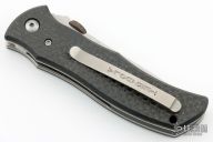 The 3/4 Century Starfighter, by Bob Terzuola. This limited edition linerlock features a carbon fiber handle. Spear point blade from 154 CPM steel. The tip up carry pocket clip and liner are both titanium. Thumb disc and notched thumb rest. "Century Starfighter" (sterling silver) is inlayed in the handle. There is a lanyard hole towards the butt of the handle. Nice detent, lockup and blade seating. Excellent condition. Comes with zipper case. Excellent condition.