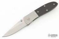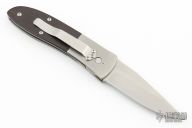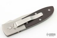 This small model 4 by Kit Carson features bead blast finished bolsters/liners and cocbolo scales. Bead blast finish blade and dual thumb studs and notched thumbrest. Bead blast finished stainless steel pocket clip, tip down clip. Nice action, lock up, detent, and blade seating. Has a couple light scuffs, otherwise excellent condition.