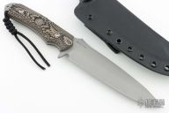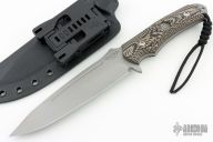 This Hide Fighter by Steve Woods and Wilson Combat features a bead blasted blade with a fuller on one side, .200" black stock and 1.606" blade depth, full tang construction. The handle has black/tan G-10 scales. Comes with a kydex sheath, challenge coin and COA. New from maker!