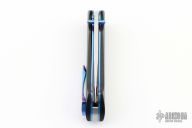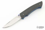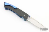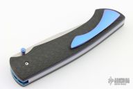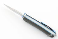 This Sparrowhawk Scale Release D/A Auto from William Tuch features a two-tone blade with dual anodized titanium thumbstuds. The handle features carbon fiber scales, anodized titanium liners with jeweled interiors, stainless steel backspacer, and tip up anodized titanium pocket clip with hidden screws. Nice detent, lockup and blade seating, strong action. Has a light scratch on the clip, otherwise excellent condition.