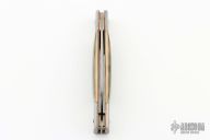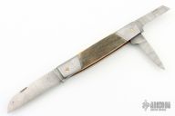 This 3-Blade Splitback Whittler by Doc Hagen features Damascus blades with nail nicks. The handle has dovetailed Damascus bolsters, brass liners, Damascus springs, brass pins, mammoth ivory covers. Has half-stops. Has a few light scratches, otherwise excellent condition. Has a spot of oxidation on the blade and a very slightly rolled tip.