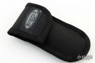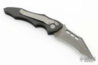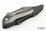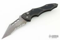 This Vector side opening automatic by Microtech Knives features a black tanto recurve blade with partial serrations. The handle has a black aluminum frame with non-slip inserts, tip down bead blasted stainless steel clip. Bronze color standoffs. Dated 05/2002 and #2308. Includes a padded zippered case. Comes with original box, papers, and nylon belt sheath. Excellent condition.