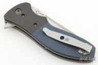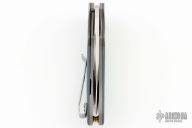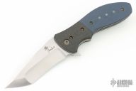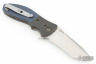 This Lambert Snap Flipper has a satin finished recurve blade. Handle has lightning strike carbon fiber bolsters, slate blue G-10 scales with GITD inlays, bead blasted titanium liners, titanium barrel spacers, and a stainless steel tip up clip. Nice detent lock up and blade seating. Has a couple light scratches, otherwise excellent condition.