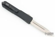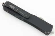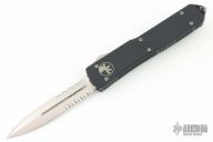 This Ultratech OTF automatic by Microtech Knives features a double edged partially serrated blade and a black aluminum handle with a black titanium clip. Includes original sheath, box and papers. #00679 and dated 11/06. Excellent condition.