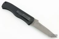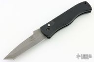 This 9700 Automatic is an Emerson Design executed by Benchmade. It features a bead blasted, chisel ground tanto style bade with swedge and notched thumb ramp. The handle is comprised black G10 scales over a black polymer backspacer. The black coated steel clip is positioned for tip down, right hand carry. Lanyard hole in pommel.  Rare and hard to find.  Comes with original box and papers. Has some light scuffs, otherwise excellent condition.