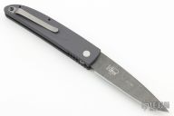 The 3200 automatic is a Mel Pardue design. Side opening, coil spring automatic. Damascus blade. Grey aluminum handle with synthetic black pearl inlay. Tumbled stainless steel clip. Sliding safety. Blade marked "21/50 ". Comes with original box and papers. Excellent condition.