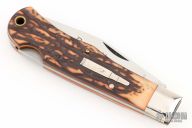 This "Tracker" bullet knife was the Remington Collector's Series Knife for 1990. This knife features a satin finished blade with a notched thumbrest and a single nail nick.  The handle has nickel silver bolsters, fo stag scales, brass liners and a stainless steel backspring.  Has a few light scratches, otherwise excellent Condition.