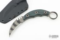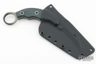 The HS Karambit is a collaboration design with Steve Tarani. Has a tiger striped double-edged hawkbill blade, .196" blade thickness and .983" blade depth. Sharpened top edge. Has black/green G-10 scales. There are light sheath marks on the blade, otherwise excellent condition. Comes with kydex sheath.
