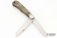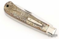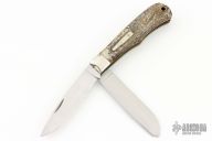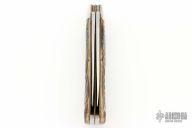 This Bullet Knife by Bowen USA has two satin finished blades with nail nicks. The handle has nickel silver bolsters, jigged bone covers, brass liners and steel springs. Has some scratches and patina, has been sharpened, has a couple small nicks in the blade, otherwise good condition.