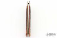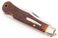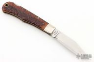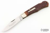 This "Bullet" Lock Back was the Remington Collector's Series Knife for 1984. Satin finished blade, nickel silver bolsters, synthetic jigged bone scales, brass liners, stainless steel backspacer. Has some scratches, has been sharpened, otherwise good user condition for its age.