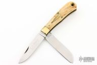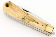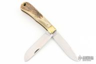 This Remington Bullet from Bowen USA was made for LL Bean. It features two satin finished blades with nail nicks. The handle has brass bolsters, stag covers with brass bullet escutcheon, brass liners and stainless steel springs. Has half-stops. Has some scratches, otherwise good user condition.  #0411