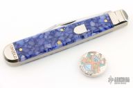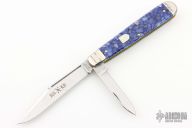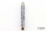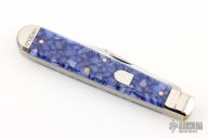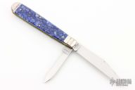 This English Jack by Northfield Knives features mirror polished blades with nail nicks. The handle has nickel silver pinched and fluted bolsters, royal blue acrylic covers with a nickel silver escutcheon, brass liners/pins. Has half stops. Comes with original tube. Excellent Condition.
