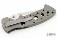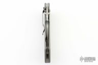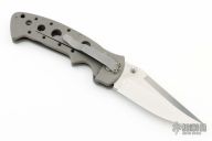 This Kasper Framelock from Pat & Wes Crawford features a satin finished blade with swedge and dual thumbstuds. The handle is comprised skeletonized bead blasted titanium frame over a bead blasted stainless steel backspacer. Matching tip down pocket clip. Comes with zipper case, and nylon belt sheath. Has a couple light scuffs, excellent condition otherwise.