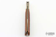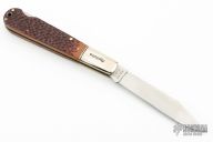 This lockback by Remmington has a satin finished blade with nail nick. The handle has nickel silver bolsters, faux jigged bone covers, brass liners and steel springs. Has a few light scratches, otherwise excellent condition. Dated 2000