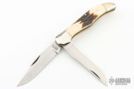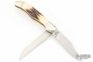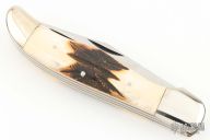 This Slipjoint by Valor features satin finished blades with nail nicks. The handle has nickel silver bolsters, jigged bone covers, brass liners and a stainless steel springs. Has some light scratches, otherwise excellent condition.