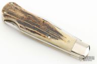 This lockback by Cutco features a mirror polished blade with nail nick and notched thumbrest. The handle has nickle silver bolsters, stag scales, brass liners, stainless steel backspacer. Has a couple light scratches, otherwise excellent condition.