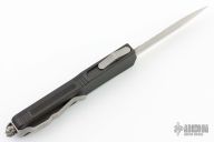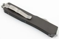 This Makora OTF automatic features a satin finish double edge partially serrated blade and black handle. Bead blast stainless steel clip and glass breaker. Includes original tube, sheath, and paperwork. Dated 01/2004; S/N 1329. Has a couple light scuffs, otherwise excellent condition.
