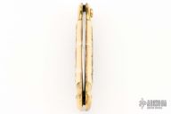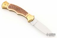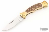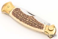 This Button Lock by Compass Industries features a mirror finished blade with nail nick. The handle has brass double bolsters, brass liners and faux stag scales, and a stainless steel backspacer. Has some light scratches, otherwise good condition.