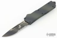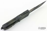 This QD Scarab Executive by Microtech Knives features a green camo finished blade with fullers and serrations. The handle is green camo aluminum with non-slip inserts, tip down SS clip and glass breaker. Comes with original tube, papers, nylon belt sheath and tools. Dated 11/2003. Has a couple light scuffs, excellent condition.