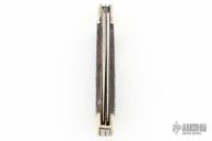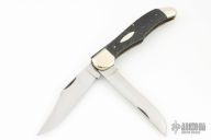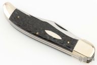 This trapper by Krusius features satin finished blades with nail nicks. The handle has nickel silver bolsters, jigged bone scales, brass liners, steel springs. Has a few light scratches, otherwise excellent condition.
