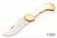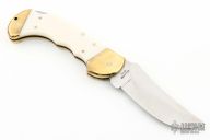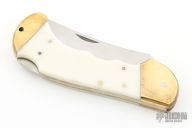 This lockback by Frost Cutlery has satin finished blade with nail nick. The handle has brass bolsters, white scales, brass liners, stainless steel spring. Has some scratches, otherwise good condition.