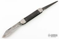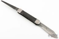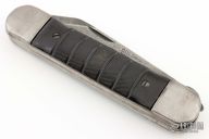 This folder by Colonial Knife Company features a clip point blade with nail nick, and a folding saw blade as well. The handle has steel bolsters, black scales, steel liners and springs. Has some scratches and patina, has been resharpened, otherwise good condition for its age.