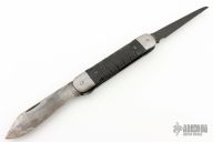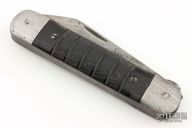This folder by Colonial Knife Company features a clip point blade with nail nick, and a folding saw blade as well. The handle has steel bolsters, black scales, steel liners and springs. Has some scratches and patina, otherwise good condition for its age.