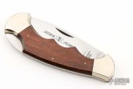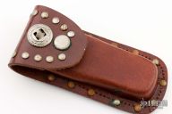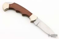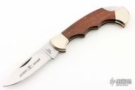 This lockback by Fulcraft features a satin finished blade with nail nick. The handle has nickel silver bolsters, dymondwood scales, brass liners, steel backspacer. Has some light scratches and patina, otherwise good condition. Comes with a brown leather sheath.