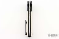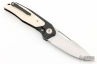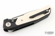 This GSD, by Liong Mah, features a satin finished blade with thumbhole, notched thumbrest and flipper. The handle is composed of a PVD coated titanium frame with ivory G10 scales, matching bead PVD coated titanium tip up clip and backspacer, lanyard pin in the butt. Nice detent, lockup and blade seating. Comes with zipper case. Has a couple light scuffs, appears to be resharpened, otherwise excellent condition.