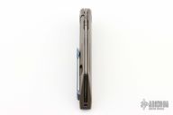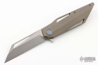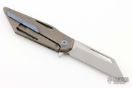 This HEA Designs Wingman features a two-tone wharncliffe blade with satin flats and beadblasted bevels, notched thumbrest and flipper tab. The handle is comprised of bronze anodized titanium, with anodized pivot, hardware, tip up clip and backspacer with lanyard bail. This piece has a stainless steel lockface insert. Nice action, detent and blade seating. Comes with zipper case. Has a couple light scuffs, excellent condition otherwise.