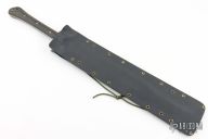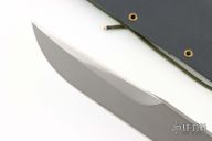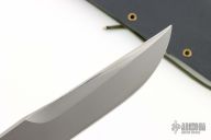 This knife by Black Cloud Knives is a Laci Szabo Design. It features a bead blast finished blade with sharpened top edge, .248" blade stock and 1.584" blade depth, full tang construction. The handle has black linen micarta scales and a lanyard hole at the butt. Comes with a kydex sheath with belt loop. Excellent condition.