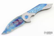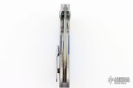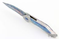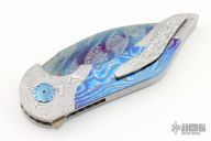 This Full Dressed Føniks Linerlock Flipper by Glenn Are Hovin features a blued Mosaic Damascus blade with false top edge and flipper. The handle has Damasteel bolsters, front and rear, custom pivot with black timascus pivot collars, black timascus scales, titanium liners with jeweled interiors and spines, Damasteel backspacer, tip up Damasteel pocket clip with hidden screws. This knife's only hardware visible is the pivot, every other screw on the knife is hidden, pretty impressive and clean. Nice detent, lockup and blade seating. Comes with original box. New from maker!