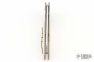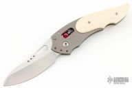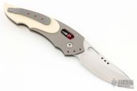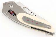 This Mosquito by Howard Viele features a satin finished drop point blade with swedge and thumb hole. The handle is comprised of a bead blasted titanium frame with bone overlays and steel backspacer. Ruby insets in the frame and clip. The bead blasted titanium clip, tip up carry. Locks using Viele's ambidextrous ball bearing lock with ruby bearing. Excellent condition. Marked #04 on blade.
