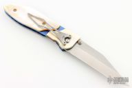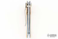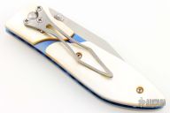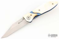 This folder by Allen Elishewitz has a tanto blade with dual thumbstuds. The handle has an anodized titanium frame with gold lip pearl overlays, jeweled interior, tip down titanium clip. Nice smooth action, good lockup, great detent, and seating. Has a couple light scuffs, otherwise excellent condition.