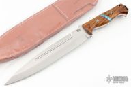 This Pig Sticker from Bark River features a satin finished blade with a full tang construction. .223" Blade Stock.  1.479" Blade Depth.  The handle has desert ironwood scales, turquoise inlays, red liners and mosaic pins.  Includes a brown leather sheath and the original box.  Excellent Condition.