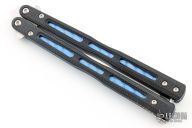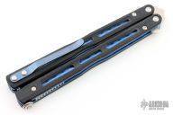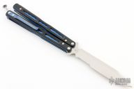This Model 51 Morpho Balisong from Benchmade has a stonewash finished partially serrated blade. Handle is black G10 with blue jeweled/ anodized titanium liners and blue anodized titanium tip up clip. Comes with original box and papers. Excellent condition.