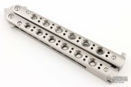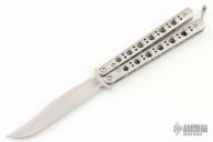 This Model 63 Balisong by Benchmade features a clip point blade with swedge. The handle has a skeletonized stainless steel construction over steel spacers, t-latch.  Comes with original box, papers and sheath.  Excellent condition.