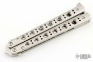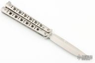This Model 62 Balisong by Benchmade features a stonewashed spear point D2 blade with a false top edge. The handle has stainless steel handles and latch.Includes the original box, papers and nylon sheath. Excellent condition.