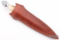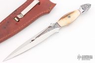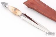 This integral dagger features a double edged mirror polished blade, walrus ivory scales, and engraving work by Ron Skaggs on the blade and handle. .37" blade thickness at the ricasso and .814" blade depth. Mosaic pins. Beautiful materials and workmanship. The sheath has some minor wear. The knife is in excellent condition.