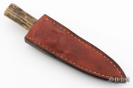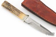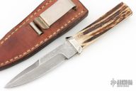 This Boot Knife by Barrett & Clair features a double edged Damascus blade with .201" blade stock and .872" blade depth, hidden/mortis tang construction. The handle has an engraved nickel silver guard with a two-piece stag grip, engraved nickel silver butt plate. Comes with a brown leather sheath with boot clip. Excellent condition.
