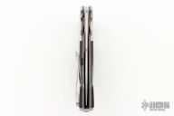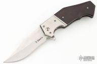This Outlaw flipper by Randy Doucette features a satin finish, bowie style blade with false top edge, notched thumbrest and flipper. The handle is comprised of satin finished titanium bolsters with burgandy linen micarta scales over titanium liners and raised notched backstrap. Titanium tip up pocket clip. Nice blade seating and lock up, crisp and fast flipping action on IKBS bearings. Has scuffs and scratches, good user condition.