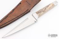 This knife by Loomis Made features a satin finished blade with sharpened top edge, .194" blade stock and 1.384" blade depth, full tang construction. The handle has stainless steel bolsters, stone scales. Comes with a brown leather sheath with rattlesnake skin inlay. Has some light scratches and oxidation on the bolsters, otherwise good condition.
