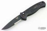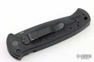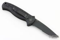 This 9052 AFO auto has a black blade with partially serrated edge. Black anodized aluminum handle. Integrated safety system. Black stainless steel clip - up or down reversible, and lanyard hole. Has some light scuffs and scratches, otherwise okay condition. This knife would make a great user.