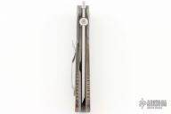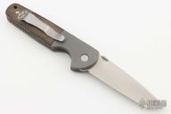 This Custom Tanto Folder from Emerson features a hand ground satin finished blade with bead blast dove tailed titanium bolsters, green micarta scales, bead blast titanium liners, tip up stainless steel clip, notched thumbrest. Thumb Disc. Nice detent, lockup and blade seating. Comes with original box. Has light scuffs and scratches throughout. Good condition otherwise.